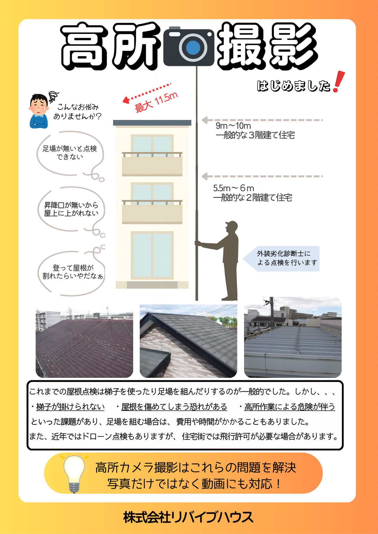 安全を最優先にしたうえで、可能な範囲で梯子を使用し、登れる場合には目視による点検も併せて行います。工事前のご不安を少しでも解消できるよう、丁寧な確認を心掛けております。なお、カメラによる撮影のみでは詳細な確認が難しい場合がございますので、点検時に図面をご用意いただけますと、より精度の高い点検が可能となります。
