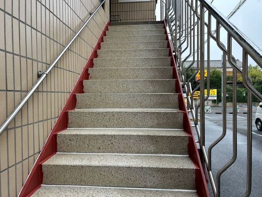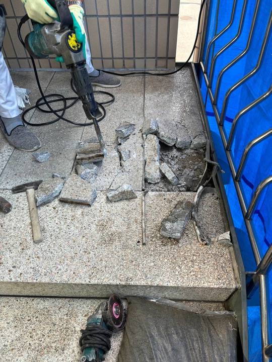 踊り場床石解体、モルタル補修・高圧洗浄