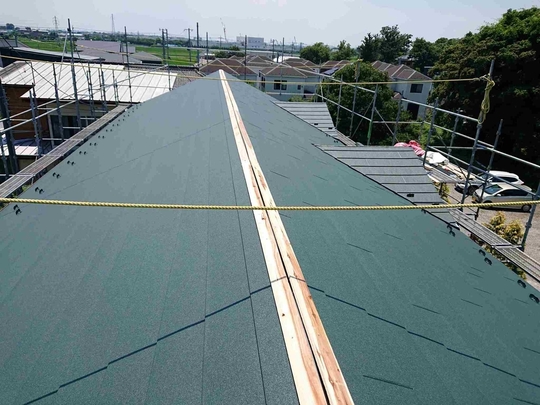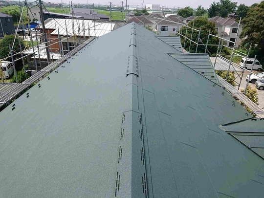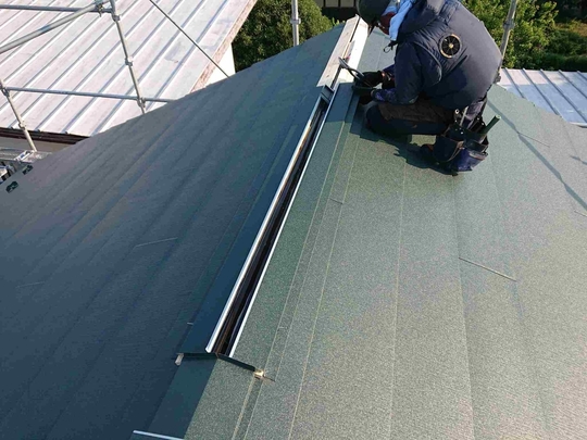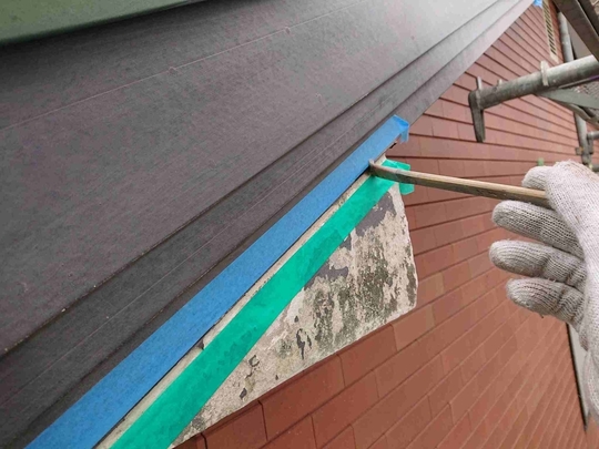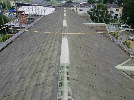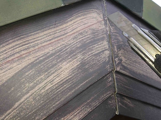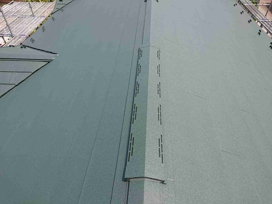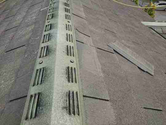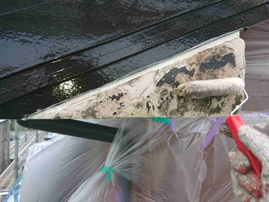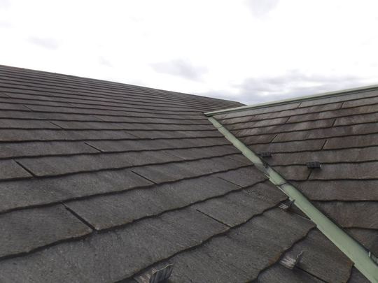 この年代のスレート屋根塗装を行う場合は普段から注意しており事前に図面等をご用意して頂いたおかげで屋根に上がる前に確認出来、適切に点検調査できました。経年劣化した屋根は歩くだけで割れたりヒビが入ってしまう場合が多く危険が伴います。また間違った施工方法で後々高いお金をかけ塗装や補修した意味がないようなことも絶対に防がなければなりません。特にこのタイプの屋根は調査せずに塗装を行っている業者も多いのが現状です。きれいにはなりますが耐久性が上がるわけでもなく逆に負荷をかける事でヒビや欠けを増やしてしまっています。そのようなことにならない為にも当社ではしっかりとした事前調査が重要と捉えております。