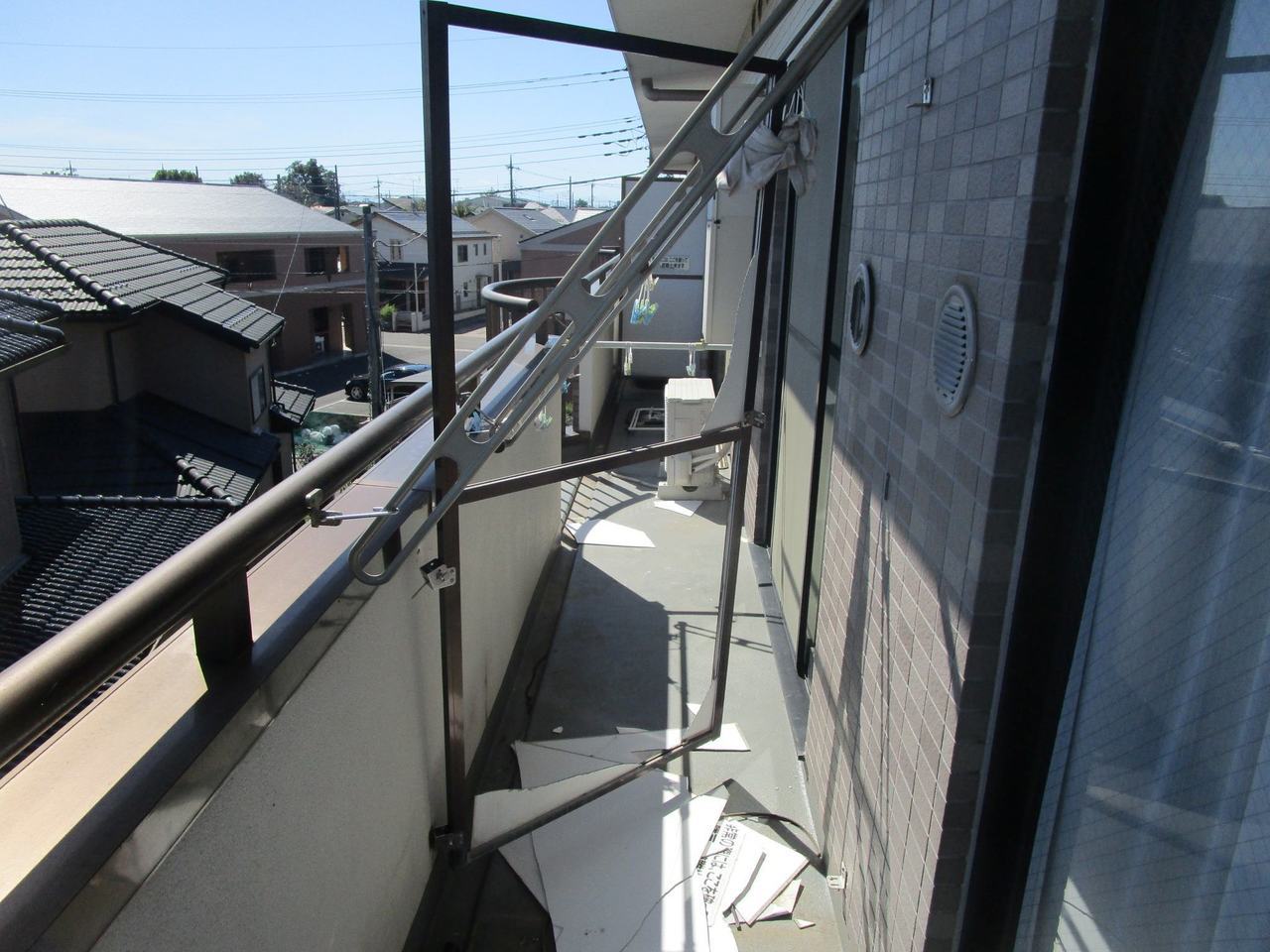 マンション管理会社様より強風によりパーテーションが破損したとのご連絡を頂きました。確認したところ、外壁に固定しているアンカーが緩んでいたことが主な原因と考えられます。固定金具周辺の外壁が長年の雨水の影響で徐々に劣化し固定力が低下していた可能性があります。今回の箇所は3Fバルコニーでしたが幸いにも階下への落下物などの二次被害はありませんでした。
