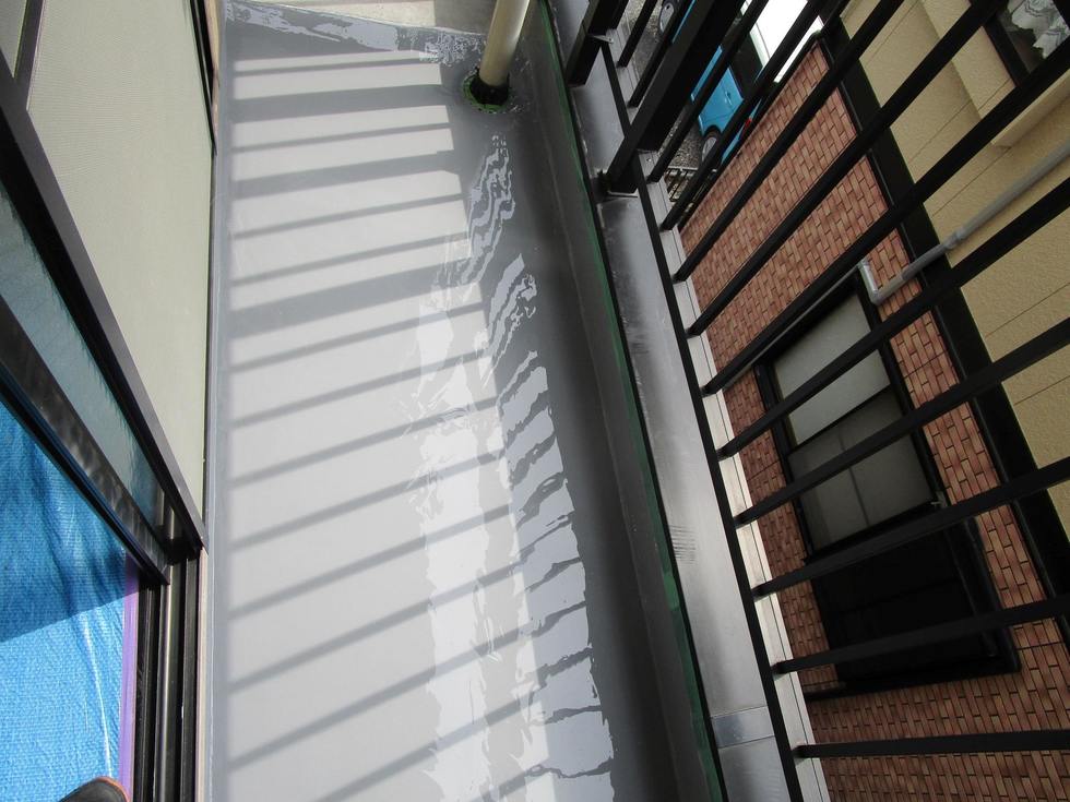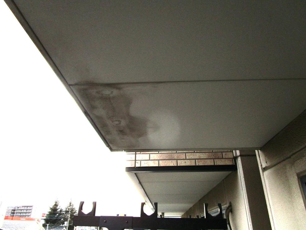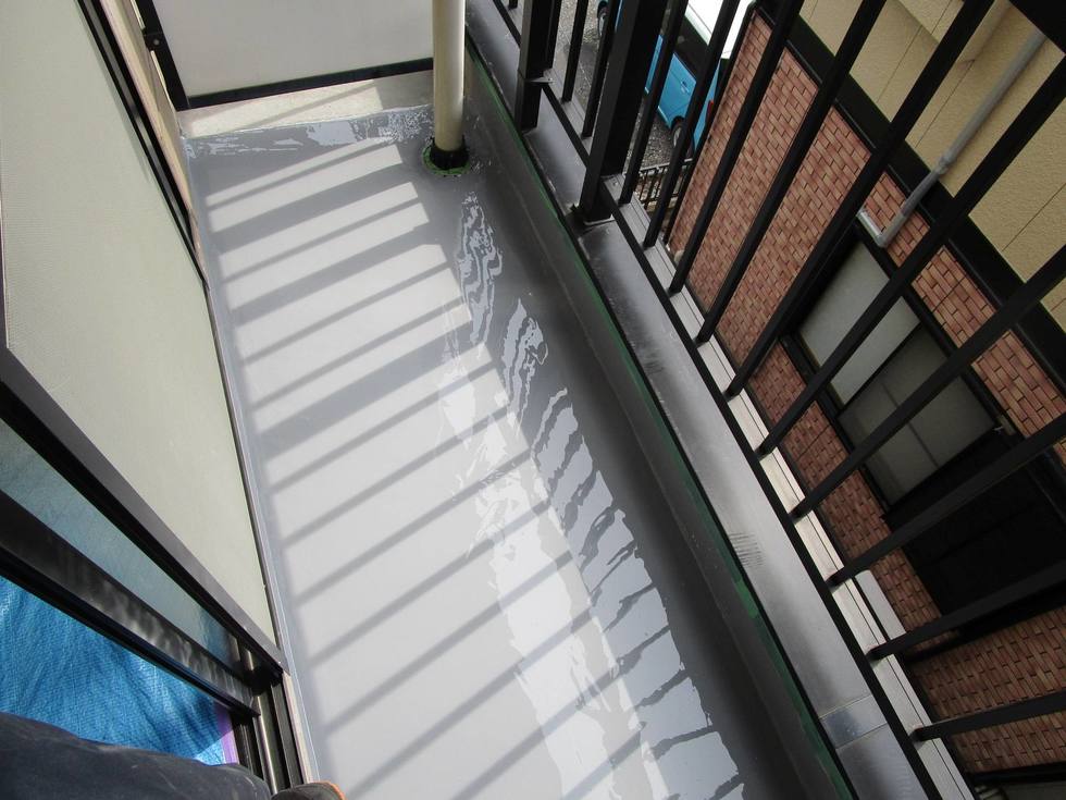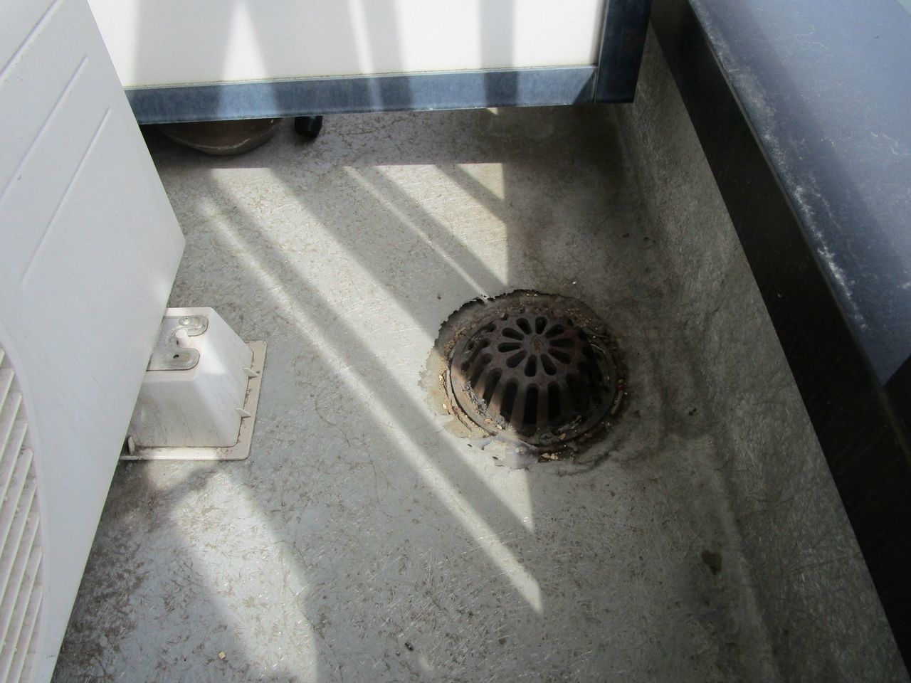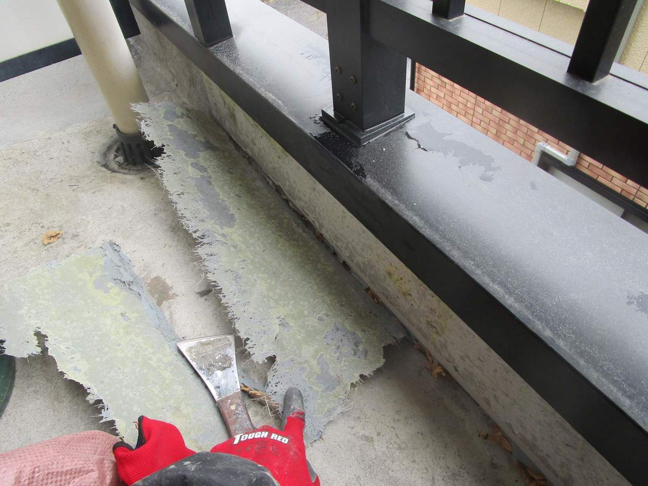 建物管理会社様からのご依頼で3F建てのアパートの雨漏り調査を行いました。2F入居者様より「バルコニー天井が変色している」とのご相談があり確認したところ、3階バルコニーのFRP防水に破断や剥離が見られ、そこから雨漏りしている状態でした。広範囲の浮きや剥離だった為、既存防水層をすべて撤去し、新たにウレタン塗膜防水をご提案いたしました。