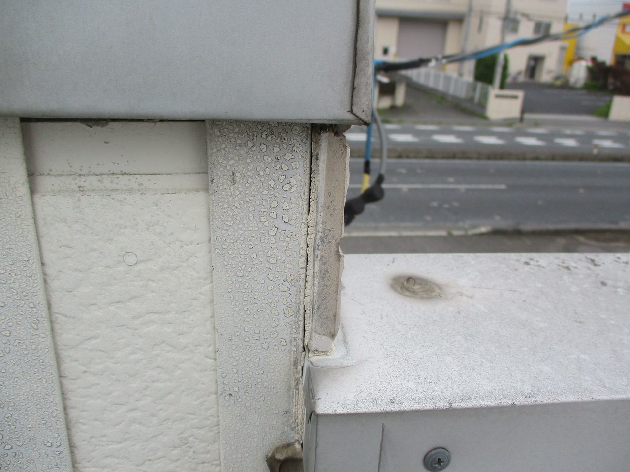 上尾市にある店舗様より「雪のあとから天井にシミができ、床も濡れている」とのご相談をいただきました。現地にて点検した所、各所のシーリング材が経年劣化により破断し、隙間が発生している状態を確認、その隙間から流入したことが原因と判断いたしました。今回目視で明確な劣化箇所が確認できたため、大掛かりな散水調査等は行わず、原因箇所のシーリング補修をご提案いたしました。